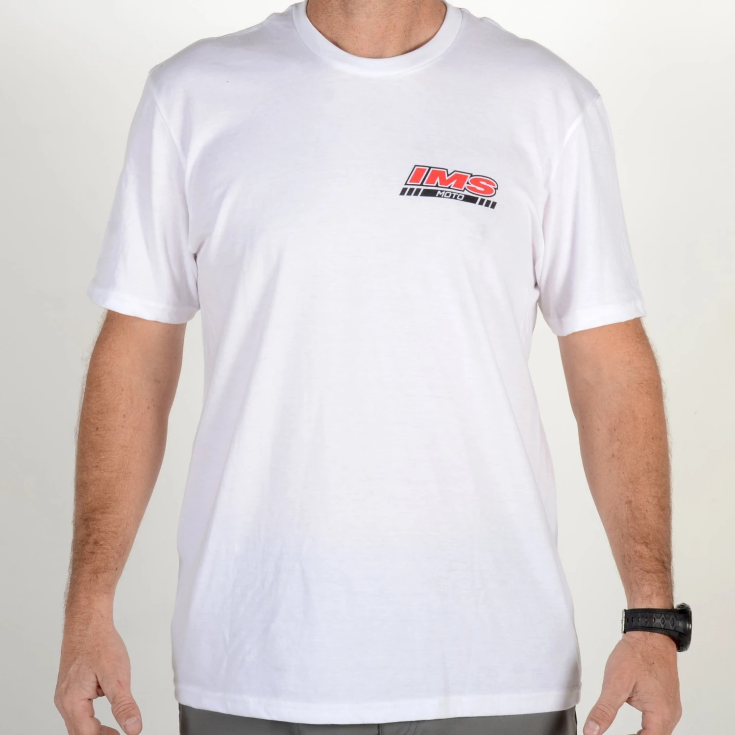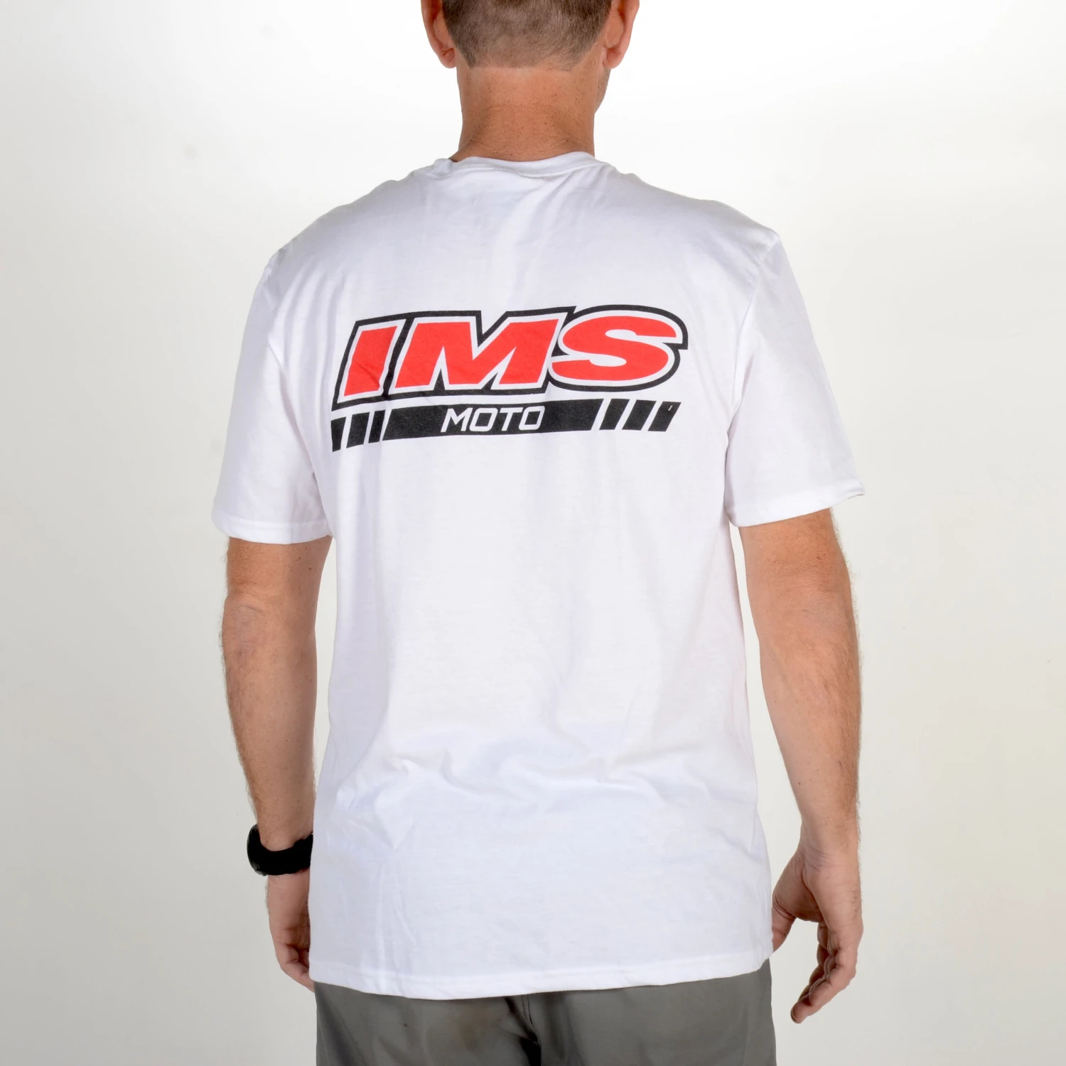 White IMS T-Shirt with large logo across the back & small IMS logo on left/front chest. Available in sizes Small – 3XL.